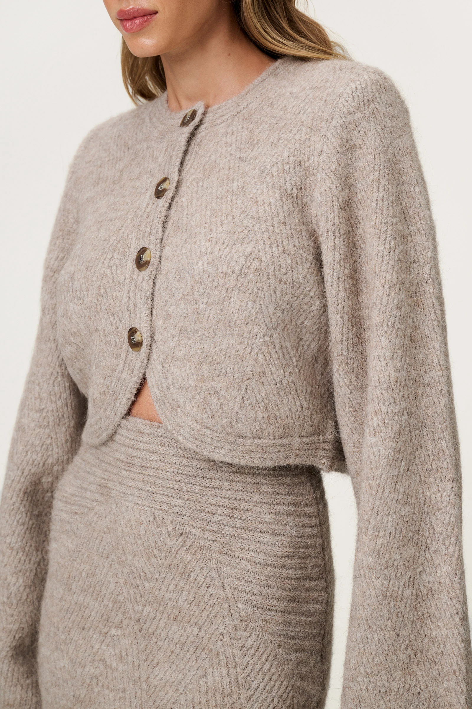 Cessole cardigan in greige featuring Adoore signature buttons, structured shoulder pads, and straight-cut sleeves. The cropped silhouette adds a refined finish to both casual and dressed-up looks.