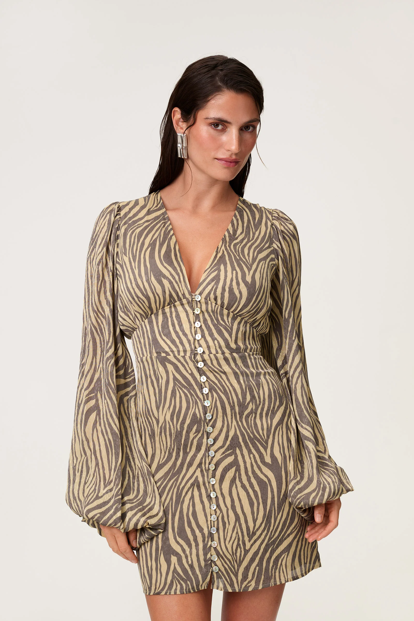 Florence mini dress in zebra print. The dress has a V-shaped neckline, buttons along the front and voluminous sleeves. The dress is mini lengthed and closes with hidden zipper at the back.