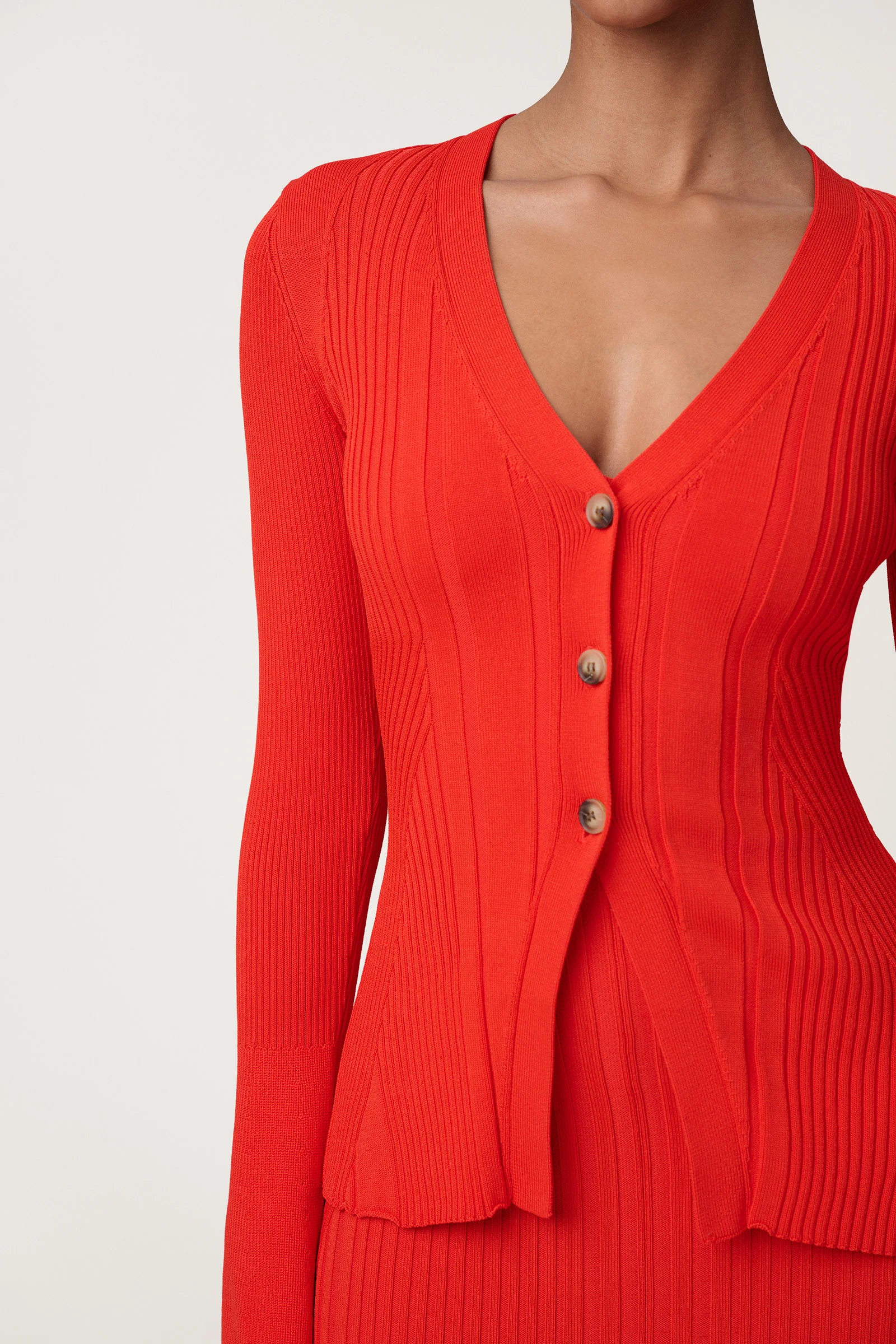 Lugo maxi dress in red features a maxi length, a defined waist for an elegant silhouette, and a mermaid-fit skirt that enhances the figure. Paired with the Lugo cardigan designed with structured shoulder pads and a defined waist for an elegant silhouette. The full-length sleeves are finished with wide cuffs for a refined touch.