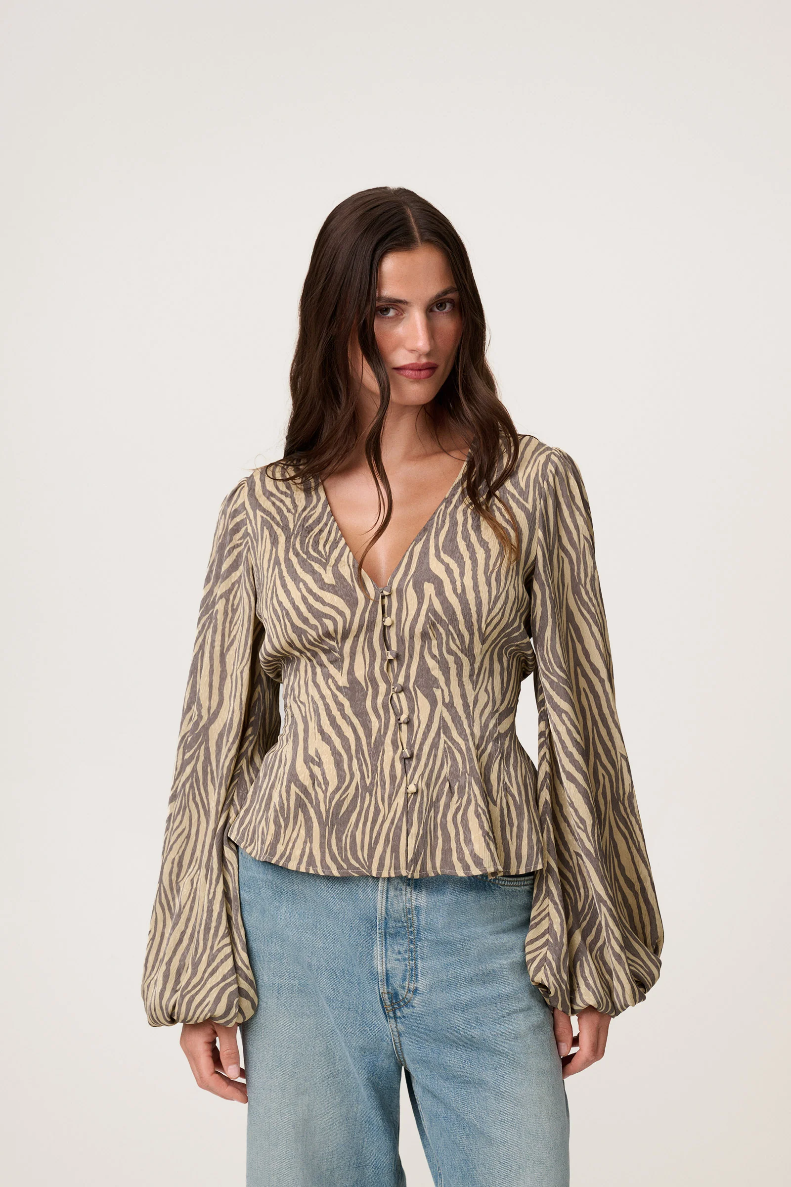 Palena blouse in beige zebra features buttons and a slits at the front, bold long sleeves, and a V-necked collar. The body is fully lined.