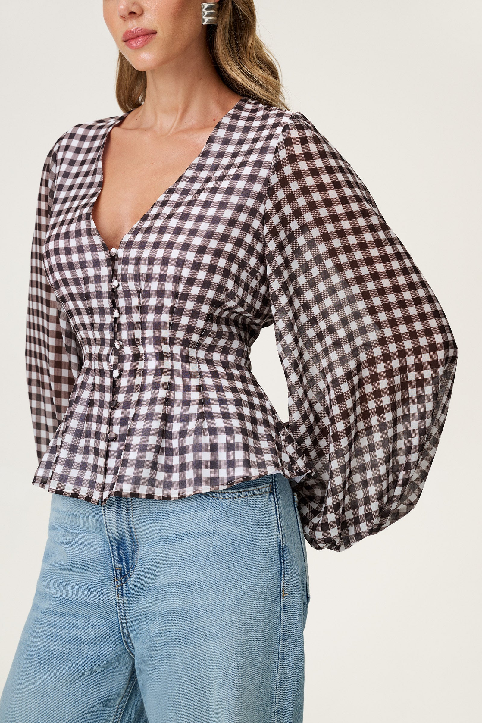 Palena blouse in brown gingham features buttons and a slits at the front, bold long sleeves, and a V-necked collar. The body is fully lined.