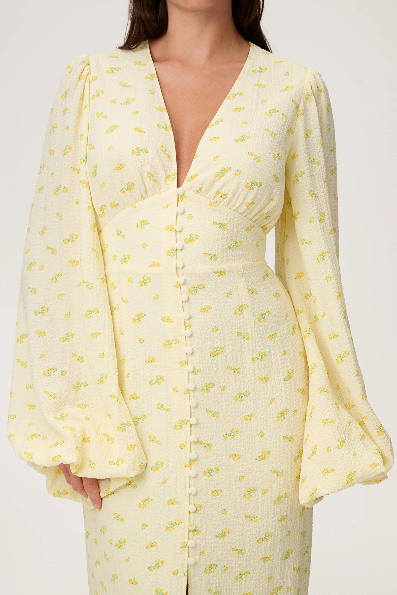 Positano maxi dress in pastel yellow. The dress has buttons and slits at the front, bold long sleeves, and a V-necked collar. The body is fully lined, has a hidden zipper at the back, and is full-length.