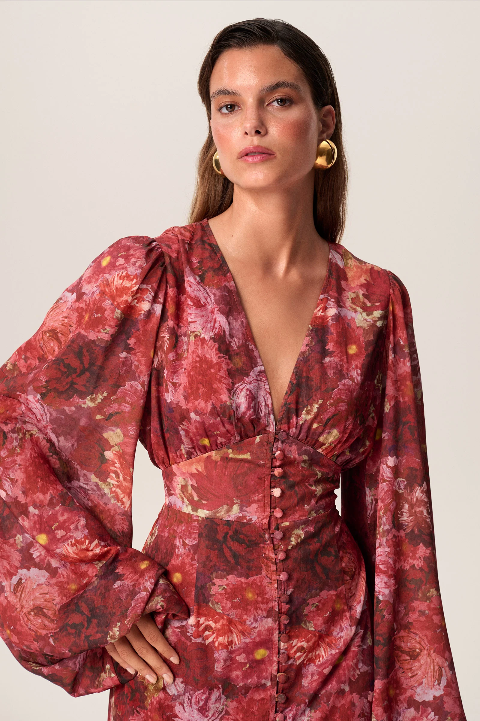 Positano Dress in rust with floral print. The dress has a V-shaped neckline, buttons along the front and a front bottom slit. It is fully lined, has full length sleeves and a hidden zipper at the back.