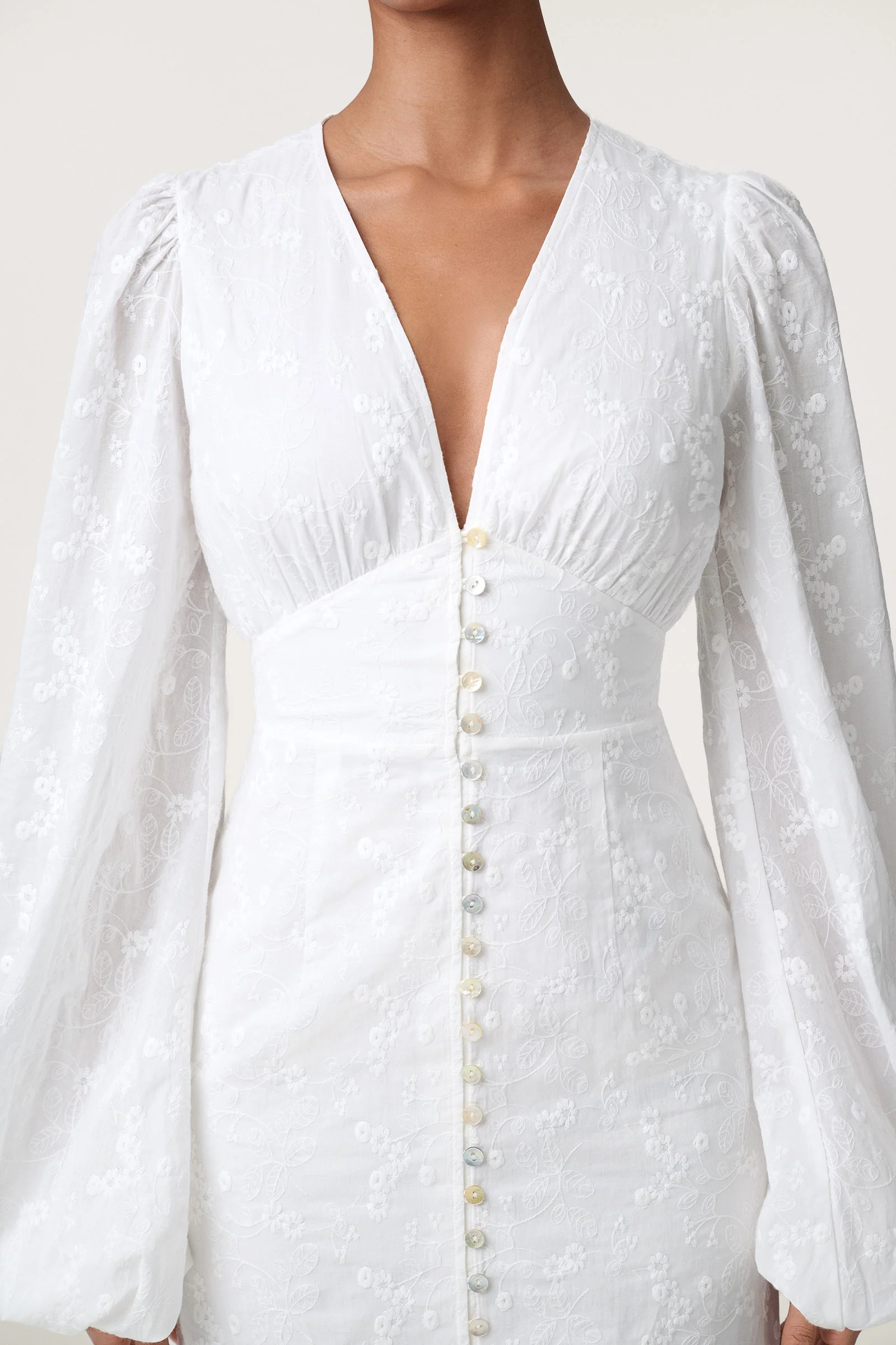 Positano Dress in white embroidery. The dress has a V-shaped neckline, buttons along the front and a front bottom slit. It is fully lined, has full length sleeves and a hidden zipper at the back. This year, this Positano Dress has been improved by adding four elastic button loops at the bottom for a more comfortable and durable fit.