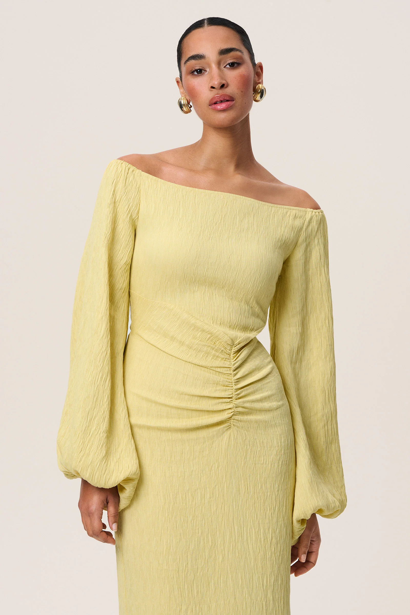 Reno maxi dress in yellow. This dress has an off-shoulder fit and full length balloon sleeves. It comes in a maxi length and features decorative ruched waist detail to create a flattering silhouette.