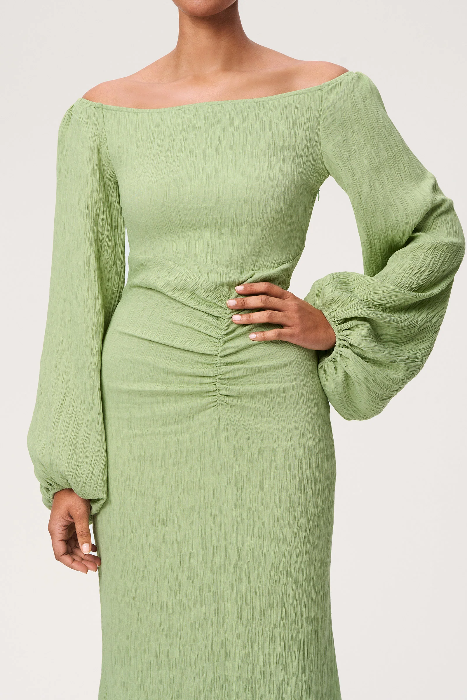 Reno maxi dress in green. This dress has an off-shoulder fit and full length balloon sleeves. It comes in a maxi length and features decorative ruched waist detail to create a flattering silhouette.