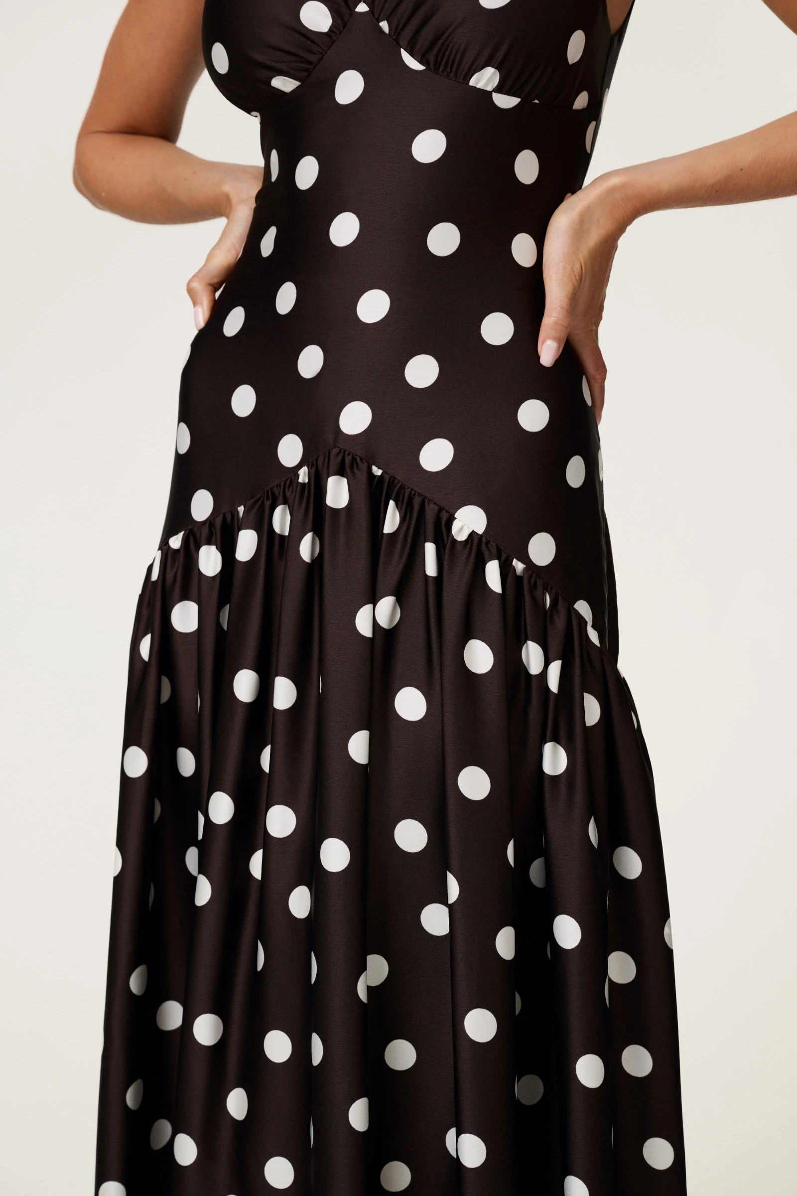 Toulouse maxi dress in brown dot. Featuring a V-neckline front and back, hidden zipper in back, subtle bust ruching and a pleated skirt for elegance. The A-shaped hip cut enhances the silhouette.